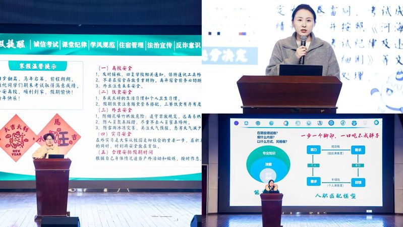 述职结束后,潘佳莹老师上台从诚信考试、课堂纪律、学风规范、住宿管理、法治宣传、反诈意识、寒假提醒方面,对员工日常管理进行强调说明。周子芮老师从与23级的相识展开,从自身的经验出发为大家讲明面对生涯规划、学习压力等困难时的处理方法。史玉莹老师从职业规划出发,从保研、考研、留学、考公、就业等方面进一步讲解了部分了解渠道及注意事项。