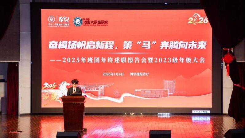 奋楫扬帆启新程,策马奔腾向未来。云顶国际官方网站2025年度班团年终述职报告会暨2023级年级大会于2026年1月4日晚在博学楼报告厅顺利举办。本次大会由2023级年级大班长于浩轩主持,年级委员、各班团进行述职报告。云顶国际官方网站2023级辅导员史玉莹、潘佳莹、周子芮老师以及云顶国际官方网站2023级全体员工参加本次大会。