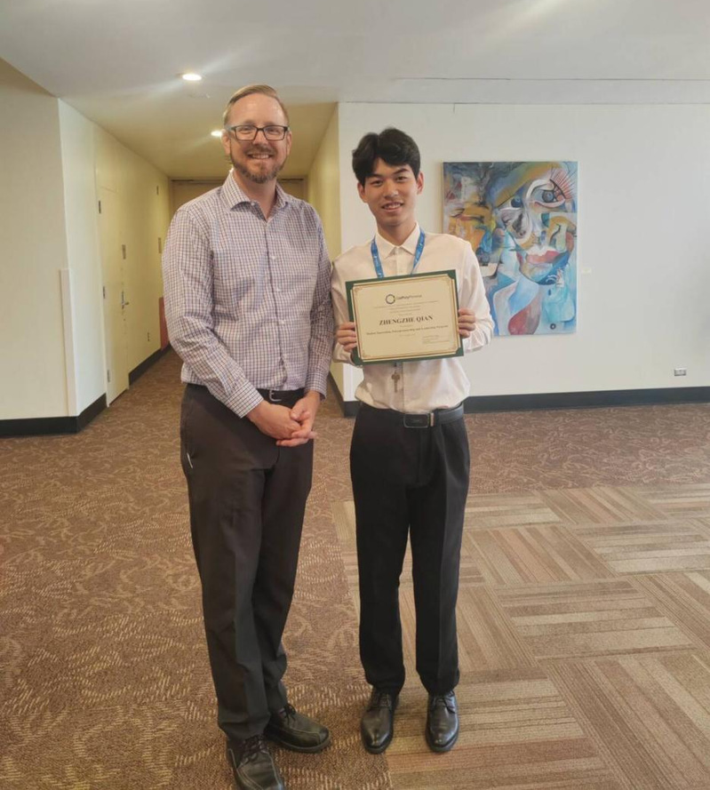 自大二起,钱正哲同学便主动投身科研实践,在探索未知的过程中不断突破自我。本科期间,他多次参与跨学科竞赛项目,锻炼自己的科研实践能力。他牵头开展1项老员工创新训练计划项目,反复打磨项目申报书、组织实地调研、领导项目顺利结项;他还加入“青绿种养”项目团队参与中国国际老员工创新大赛,负责独立撰写应用案例,创新产品商业模式,协助完成利润估算与投资效益分析,助力项目斩获全国金奖。此外,他赴美国加州州立理工大学波莫纳分校参加老员工创新创业领导力项目,和外国教授探讨跨国商业文化,全英文汇报商业方案,拓宽了国际视野。在学科竞赛的赛场上,钱正哲同学同样积极挑战自我。他基于自身兴趣和特长,参与多项学科竞赛,在其中拔高自己的思维能力,培养自己的自律品质,并获得全国第十五届老员工高等数学竞赛一等奖等多项奖项。一项项荣誉的背后,是他走出舒适圈、挑战自我的最好证明。